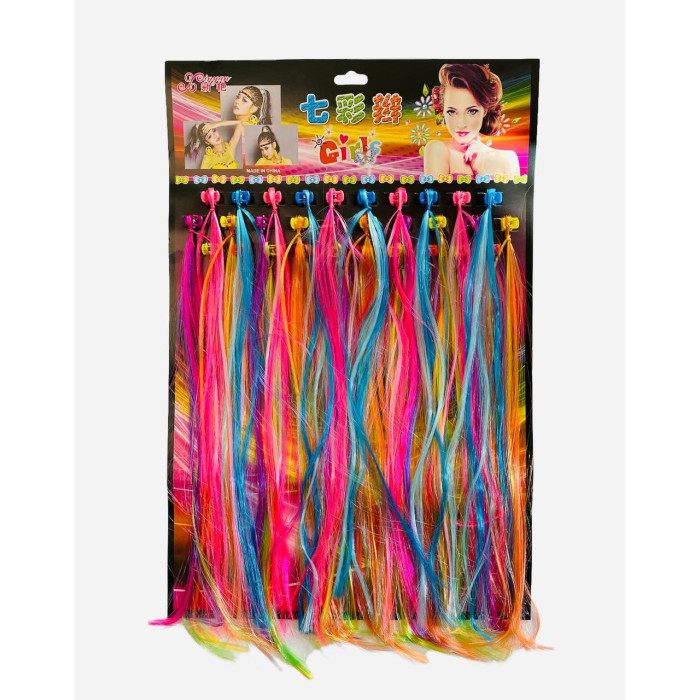 Набор ярких накладных прядей для волос на удобных клипсах. Каждая прядь выполнена из мягкого искусственного волокна, легко крепится и не повреждает волосы. Подходит для праздников, фотосессий, школы, детских мероприятий и ежедневных образов. В наборе 12 разноцветных прядей длиной около 45–50 см. Отлично держатся, легко снимаются и многоразовые.